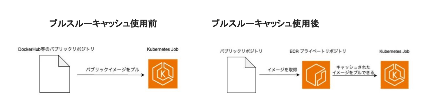 CircleCIと比較してKubernetes Jobの実行時間が安定しておらず、かつより多くの実行時間を要していたため複数の高速化施策の検証を行っていました。そのうちの一つとして、テスト時にローカルで使用するmysqlやredisといったDockerコンテナの起動をプルスルーキャッシュを用いて高速化できるかどうかを検証しました。プルスルーキャッシュは以下のように、キャッシュされたイメージをECRのプライベートリポジトリからプルできるという機能で、コンテナ起動の高速化が期待できます。