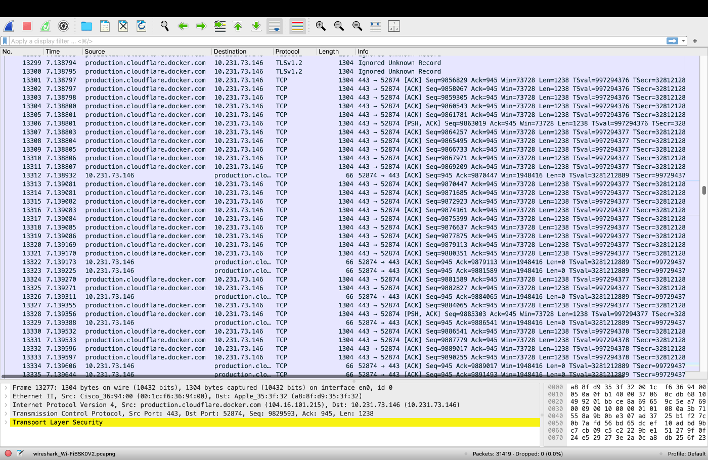 検証方法はシンプルで、wiresharkを起動しながら適当なDockerイメージをpullするというものです。その結果、cloudflareからリスポンスが提供されていることが確認でき、Docker Hubのイメージはそもそもcloudflareにキャッシュされているため、プルスルーキャッシュを用いることでイメージのpullが高速化されるわけではなさそうという検証結果が納得できるものになりました。