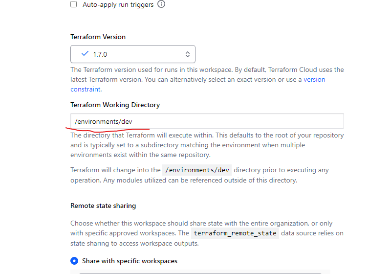 対象のworkspacesのTerraform Working Directoryに設定が必要だったようだ。