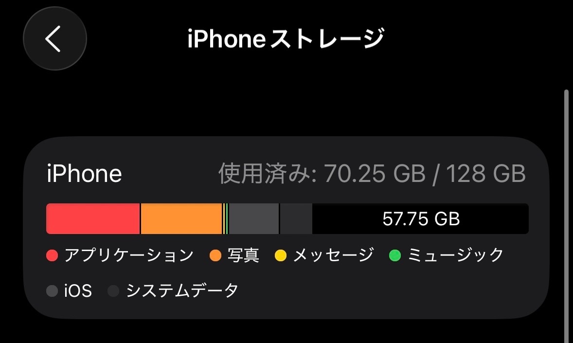 私の場合、「設定 > 一般 > iPhoneストレージ」を確認すると、システムデータが異常に大きい状態でした。キャッシュ削除やアプリのオフロードを試しても効果が薄く、初期化が最善策となりました。