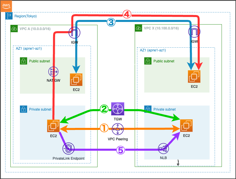 | ①VPC Peering | 5Gbps | 参考ドキュメントa.およびb.。シングルフロー制約。 |