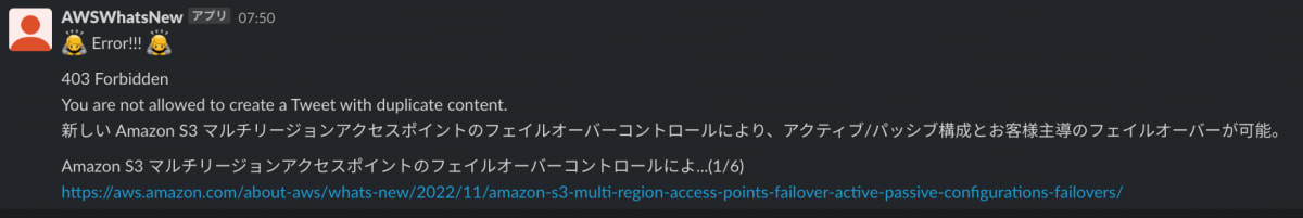 エラー発生頻度は1ヶ月に1,2回程度で、内容はほとんどTwitter APIから返却される↓ツイート重複エラー↓です。