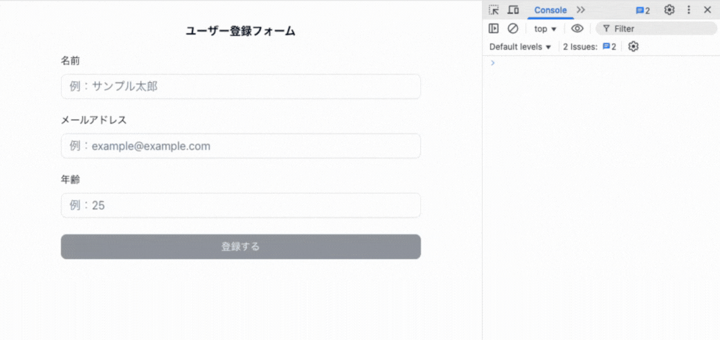 ここまでで、フォームの各入力フィールド(name・email・age)がReact Hook Form に登録され、入力内容を自動で管理できる状態になった。