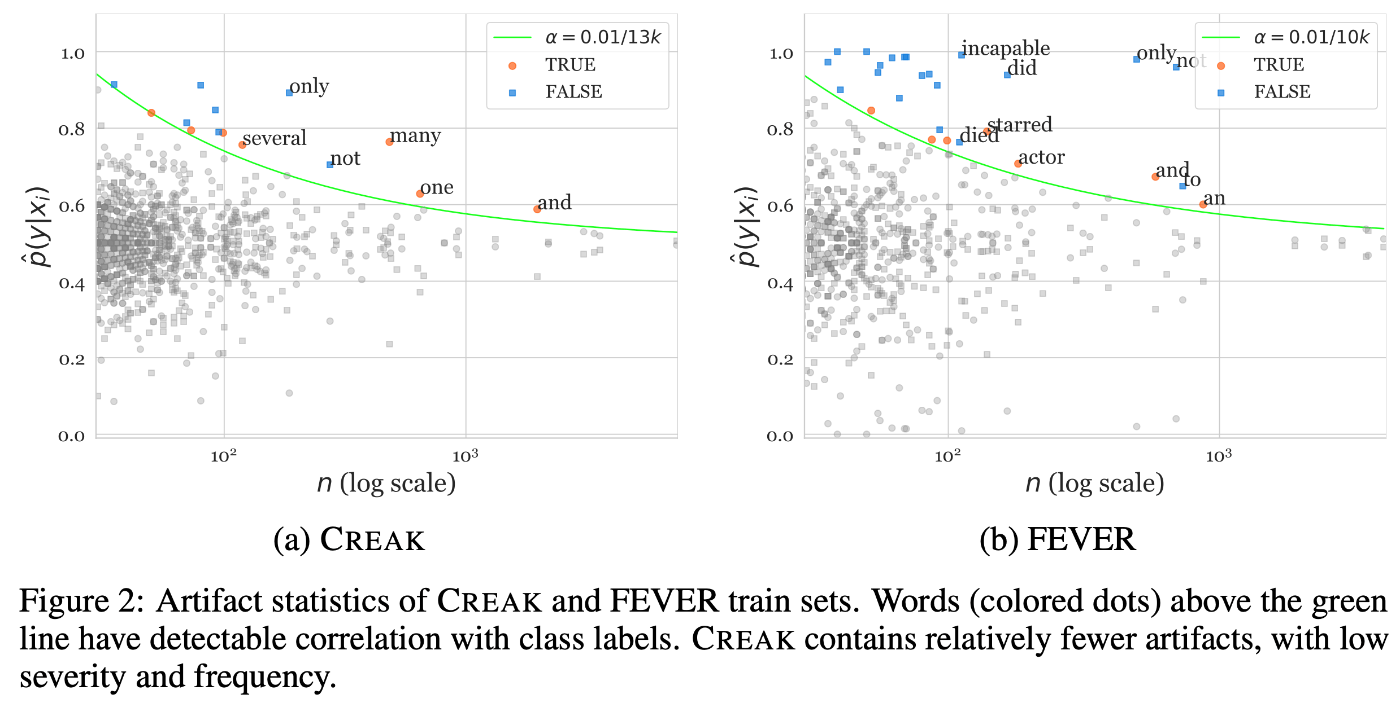 このようなデータセットでは、アーティファクトというデータセット作成時に意図せず生じてしまう、テキストの表面的な特徴とラベルとの間の偽の相関関係が少ないことが望まれる。なぜなら、モデルがこれらのアーティファクトを学習してしまうと、真の推論能力ではなく、表面的な特徴に基づいて予測を行ってしまう可能性があるからである。上図は、単語の出現頻度(横軸)とその単語が真または偽の主張と相関する確率(縦軸)の関係をプロットしたものであり、緑色の線は統計的に有意な相関を示す閾値を表す。この分析結果より、CREAKは既存のデータセットであるFEVERと比較してアーティファクトが少なく、その頻度も低いことがわかった。これは、CREAKがより質の高いデータセットであり、モデルがアーティファクトに頼らずに真の推論能力を学習できることを示している。この事例では、提案するデータセットに固有の望ましい要件に対して、既存データセットと比較した分析結果を載せ、データセットの質について議論している。