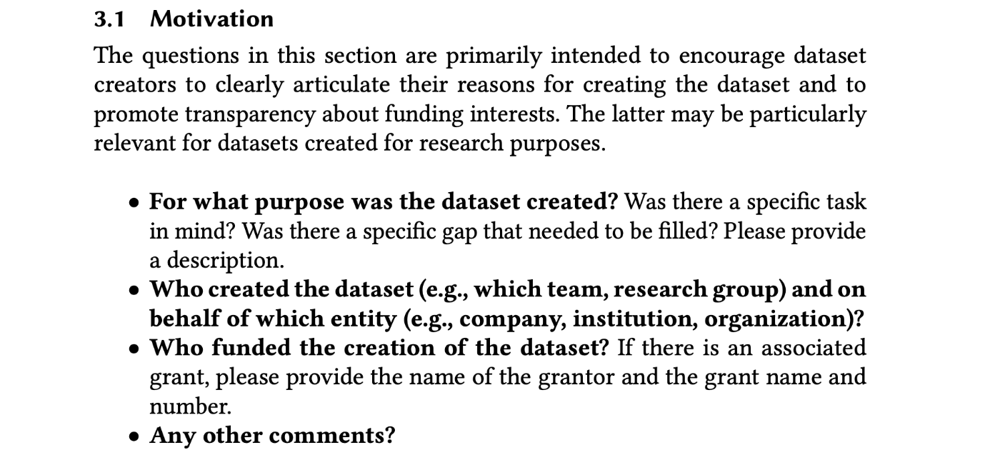 新たなデータセットを提案する論文をD&B Trackへ投稿する場合、supplementary materialsとしてデータセットに関する詳細な説明を記述したドキュメントを提出する必要がある。このドキュメントのテンプレートとして、NeurIPSが推奨しており、多くの論文で採用されているのがDatasheets for Datasetsである。このDatasheetsは下に示したようにデータセットをドキュメント化する上で重要な質問(下の太字)が多く含まれており、作成者はその質問に回答する形でドキュメントを作成する。