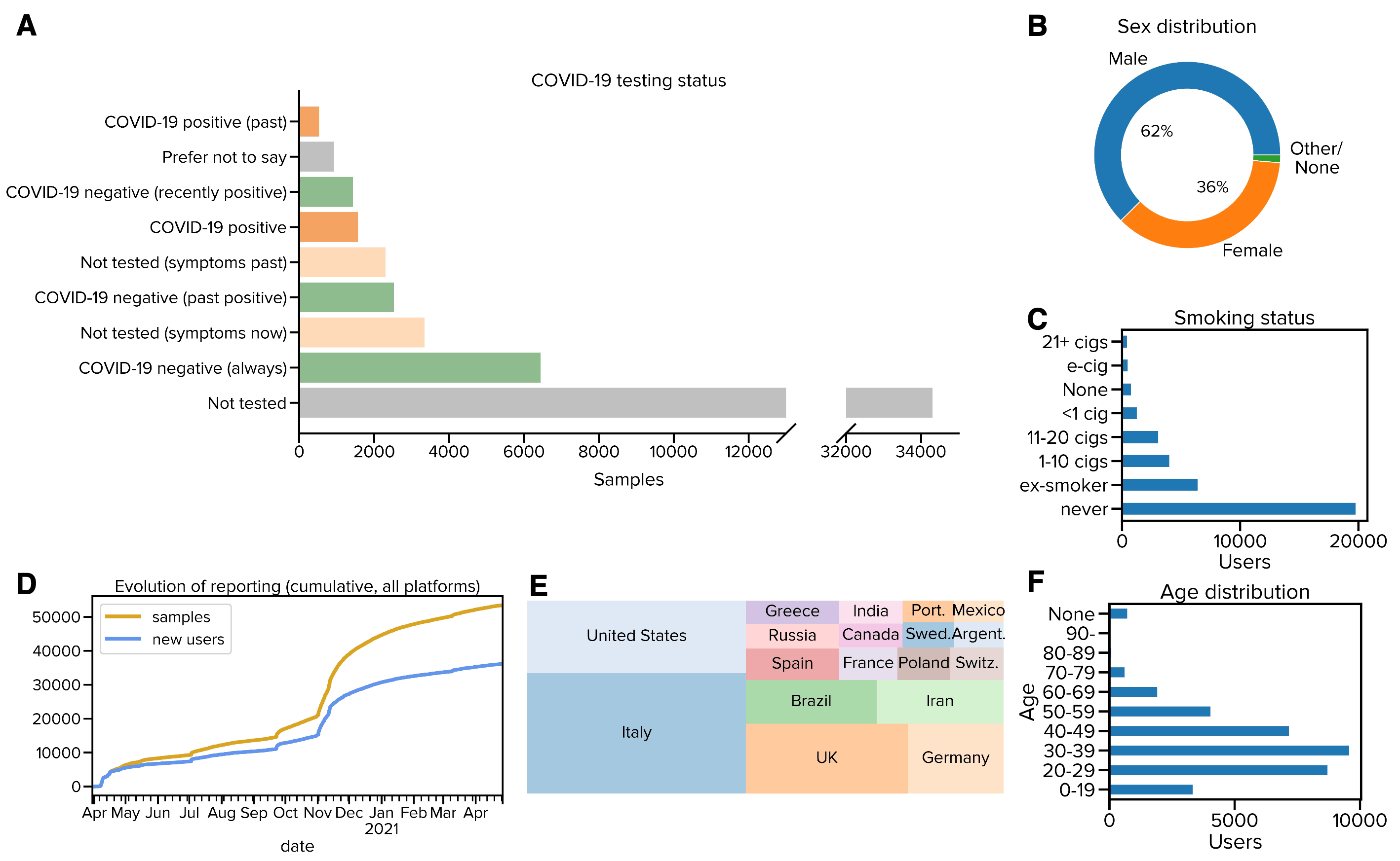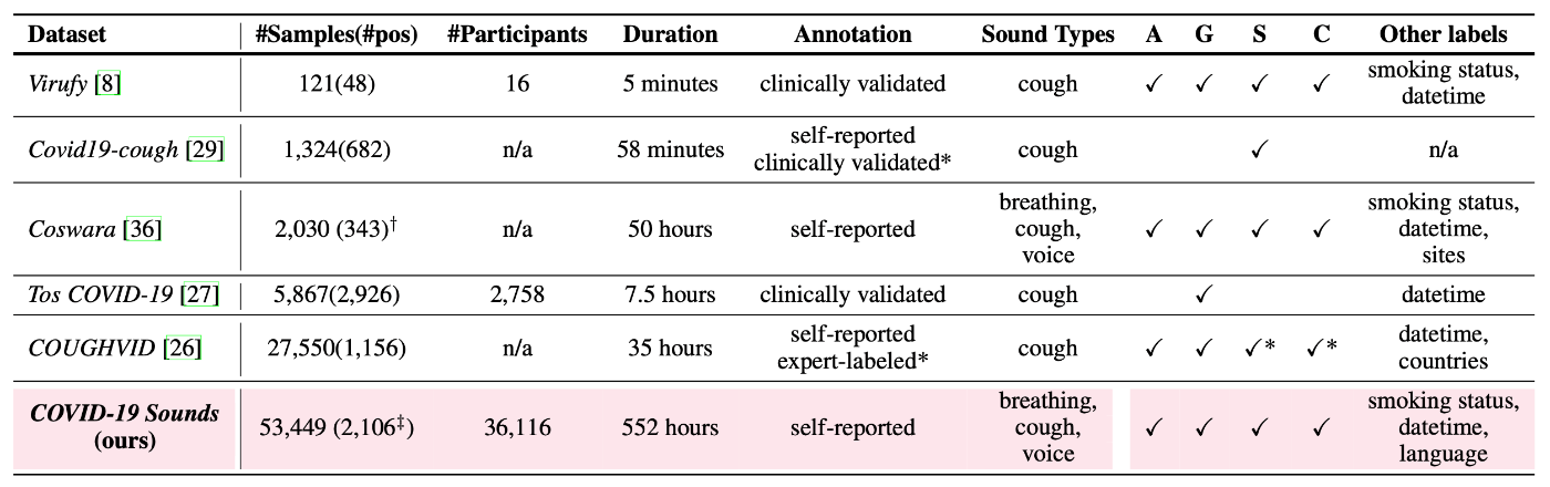 COVID-19 Soundsは、COVID-19陽性およ陰性者から収集した呼吸音、咳、声からなる大規模な音声データセットであり、機械学習を用いたCOVID-19の感染予測に活用できる。このような音声データセットを用いてより汎用性・信頼性が高いCOVID-19の診断モデルを開発するためには、収集対象の人の多様性が高いことが望まれる。そこで、本論文中では上図のように、(A)COVID-19の診断ステータス、(B)性別、(C)喫煙状況、(E)国籍、(F)年齢の統計情報を可視化し、COVID-19 Soundsが人口統計的に多様であることを示している。この事例では、他のデータセットとの比較ではなく、提案するデータセットの特徴を様々な観点からグラフ化することで、データセットの多様性が高いことを主張している。