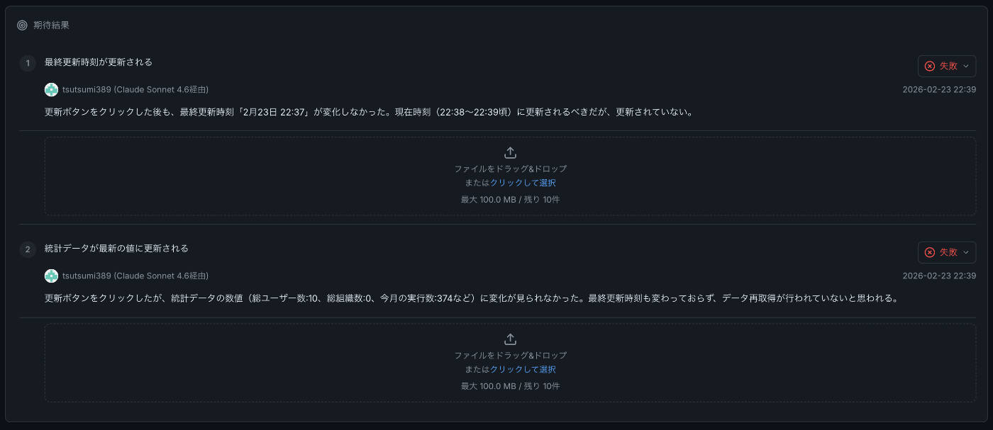 テストは、正しく実行できれば7件中2件がFAIL(バグを検出)として記録される設計です。つまり「2件がFAILになること」が正しいテスト結果です。