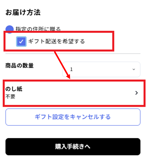 指定した場所にギフトエリアが表示されますので「ギフト配送を希望する」にチェックを入れます。