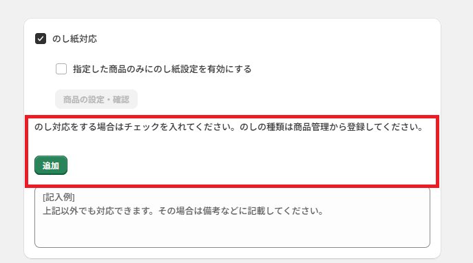 「のし対応する場合はチェックを入れてください。のしの種類は商品管理から登録してください」と記載されている下の、「追加」を押します。