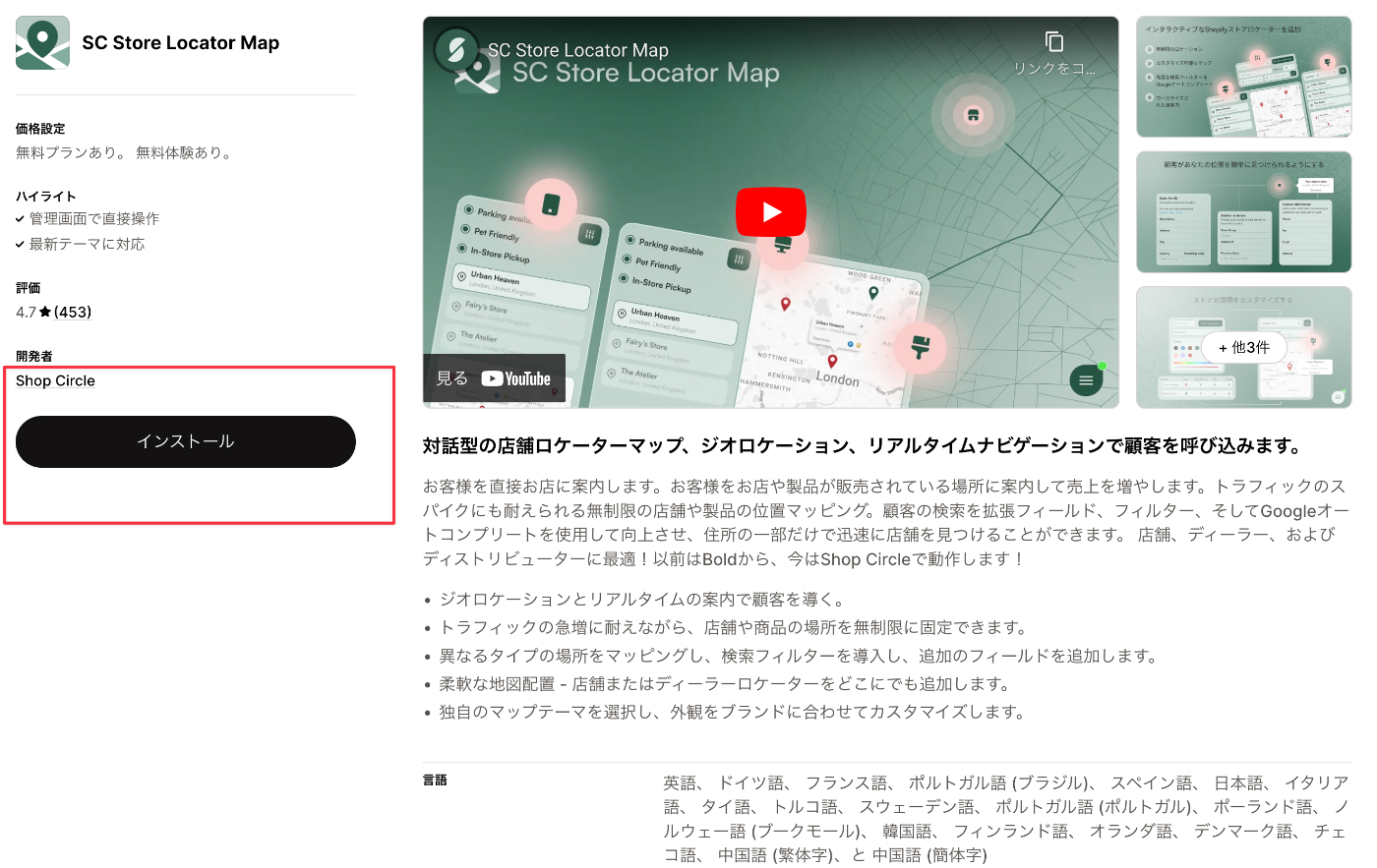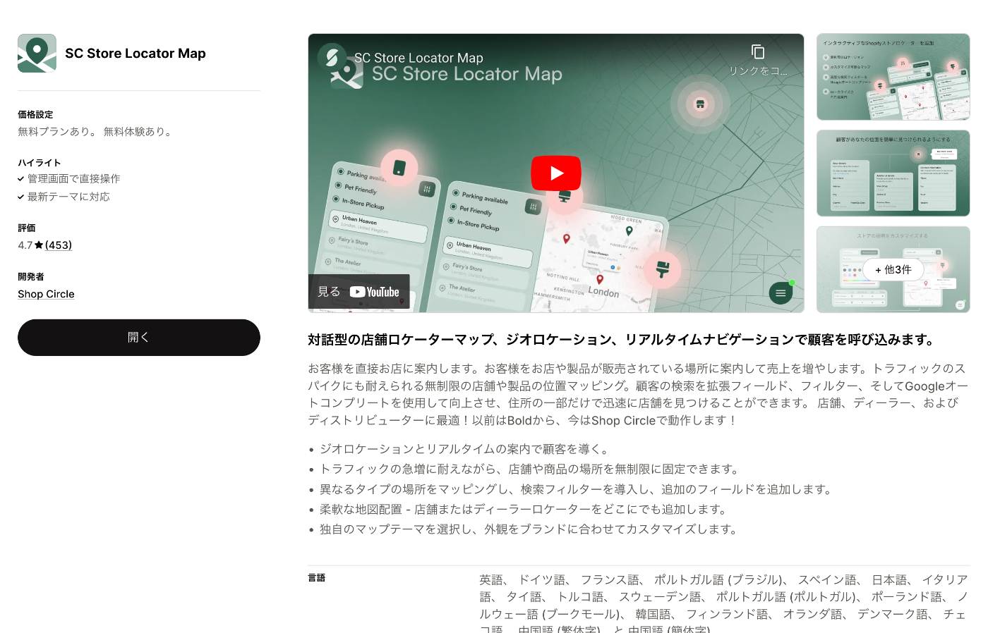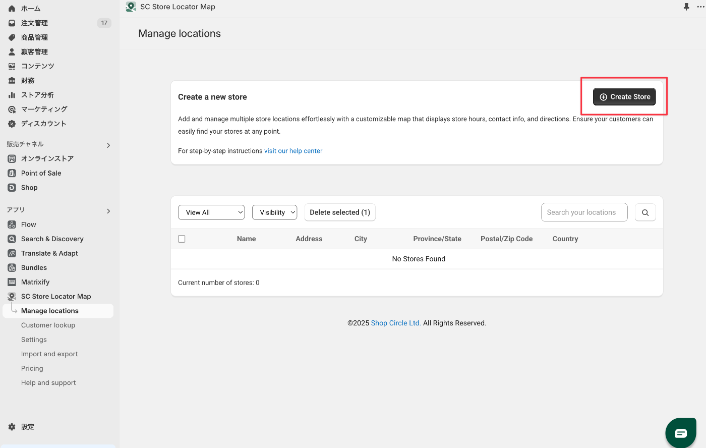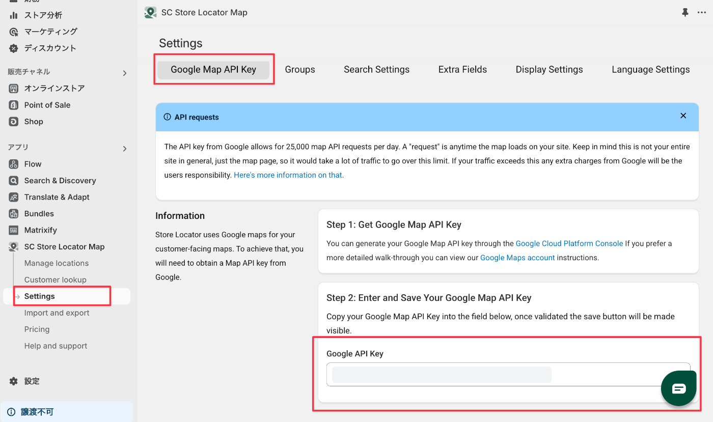 英語での管理画面が多いShopifyアプリですが、SC Store Locator Mapは日本語対応しているのでその点も使用しやすいポイントです!