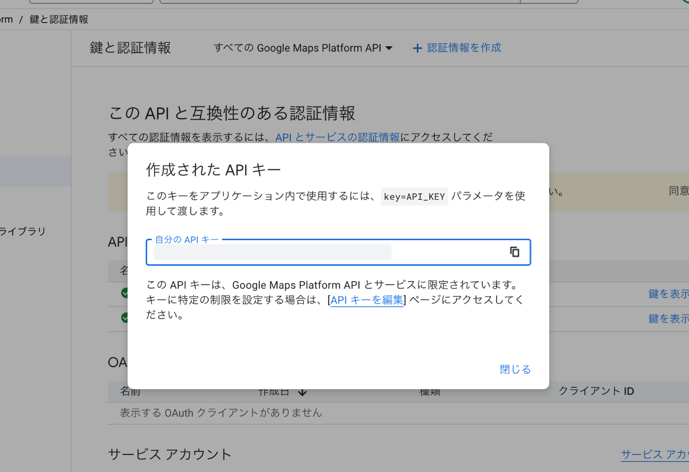 この段階でAPIは作成されますが、セキュリティを考慮しキーの制限はかけてください。