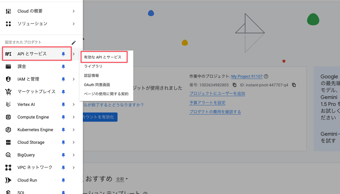「APIとサービス」→「有効なAPIとサービス」を選択