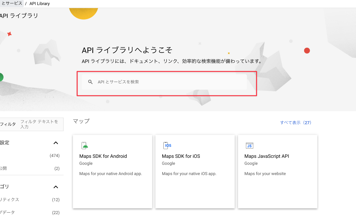 下記検索フォームで必要なAPIを有効にする