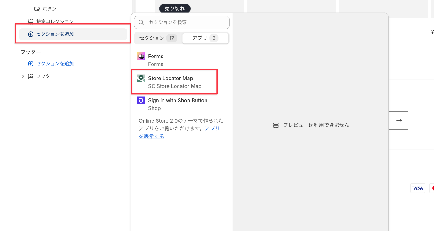 セクションの追加から「SC Store Locator Map」のセクションを設置し保存