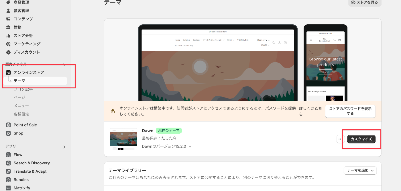 「オンラインストア」→「テーマ」→「カスタマイズ」でアプリセクションの設置