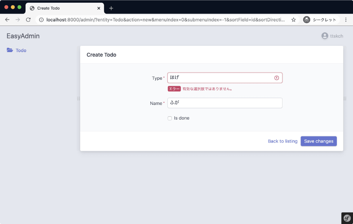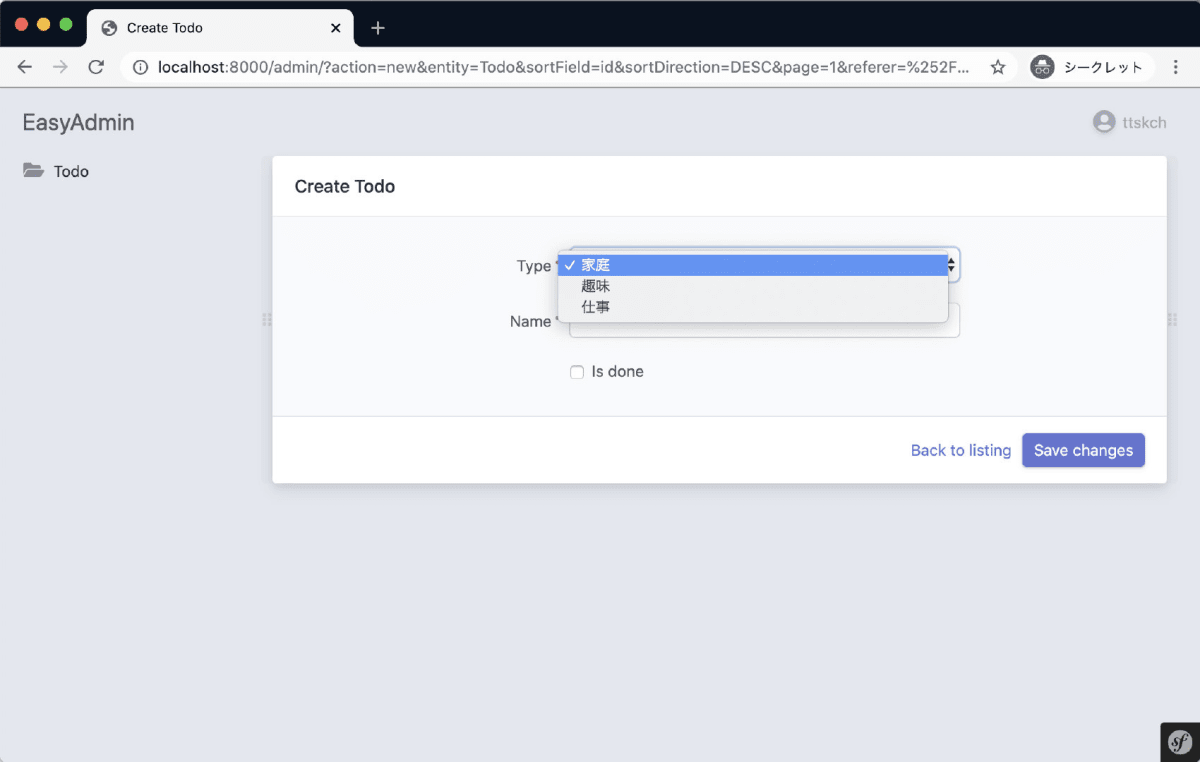 このように、 ChoiceType を継承して choices オプションにデフォルト値を設定した TodoTypeChoiceType を作り、 easy_admin.yaml で以下のようにこの TodoTypeChoiceType を使うようにすればOKです。