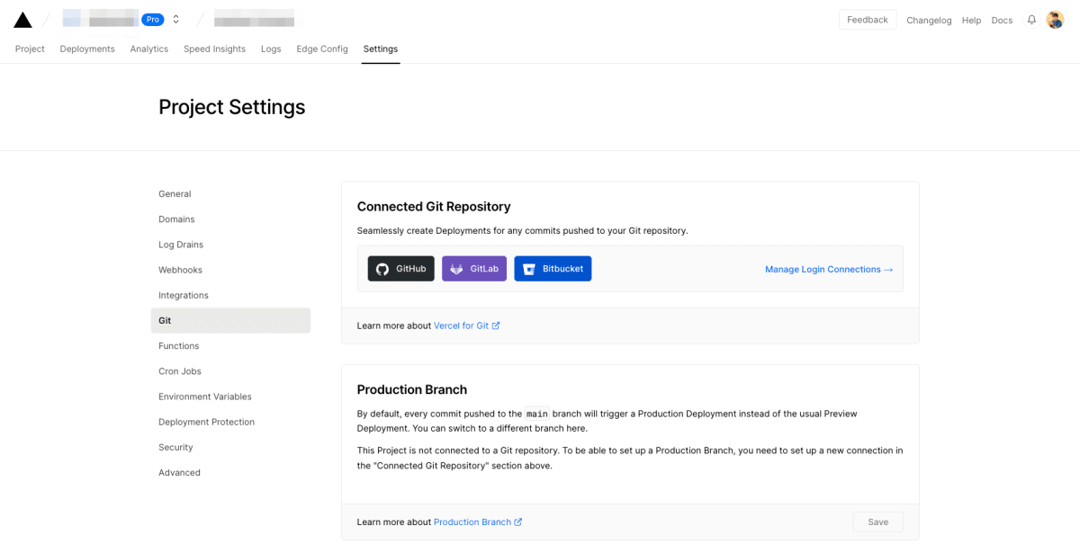 この画面の GitHub ボタンからリポジトリを選んでセットするだけで、そのリポジトリへのコミットが自動でVercelにデプロイされるようになり、さらに Production Branch で指定したブランチへのコミットの場合のみ自動でProduction環境にプロモートしてくれるようになります。