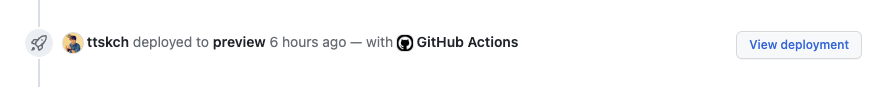 で利用されており、これによって preview という名前のデプロイ環境にVercelのプレビューデプロイのURLが紐づき、結果としてPRのConversationタブに下図のような行が出力され、PRの画面から直接プレビューデプロイを見に行くことができるようになります。