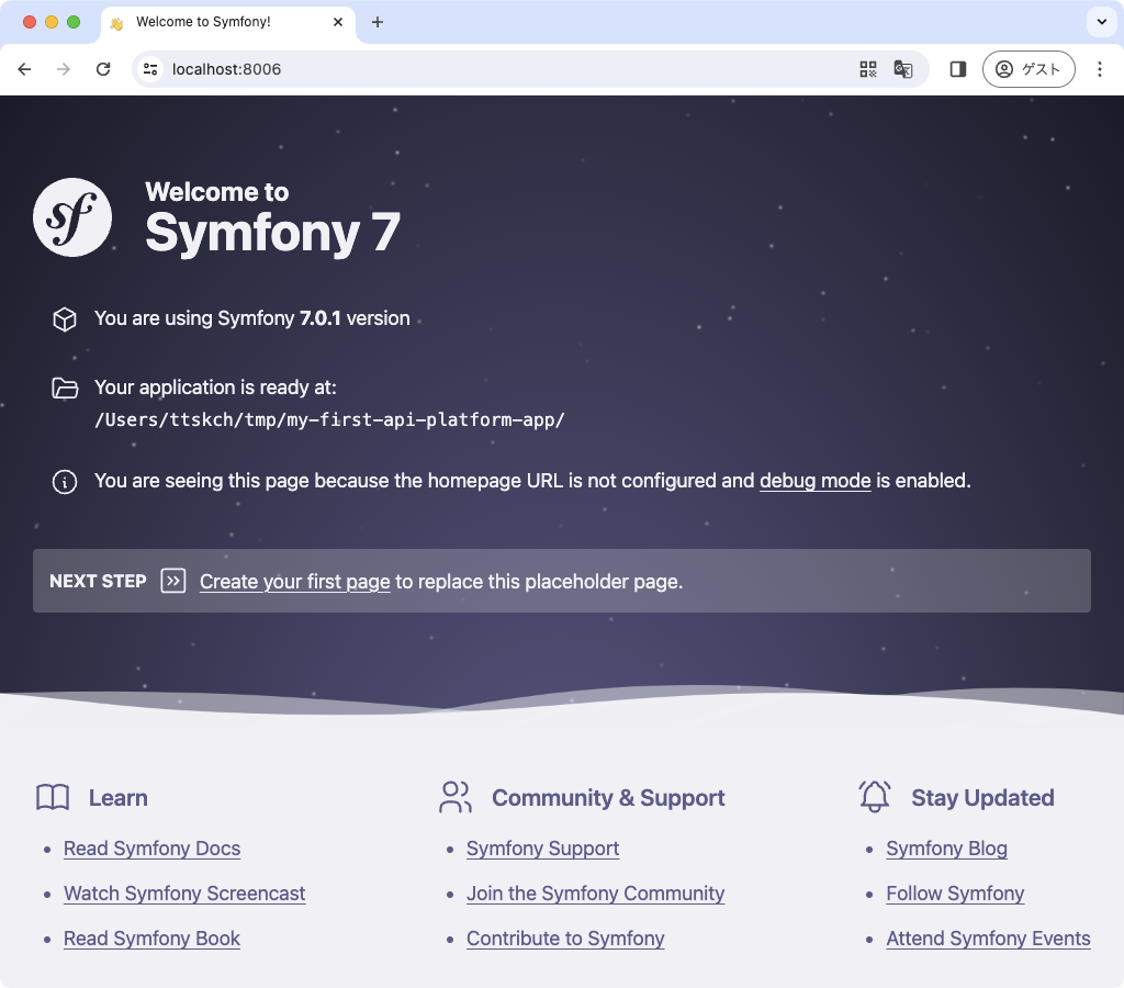 この画面は、Symfonyアプリケーションにまだルートパス(/)に対応するページが実装されていない場合に、開発環境においてのみ表示されるデフォルトのWelcomeページです。