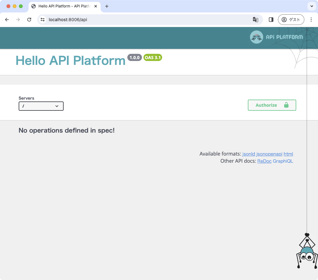 この画面は、API Platform Coreによって自動で生成された、Swagger UI製のAPIドキュメントページです。今後、API Platformの機能を使ってAPIを作成していくと、自動的にこの画面にAPIドキュメントが追加されていくことになります。
