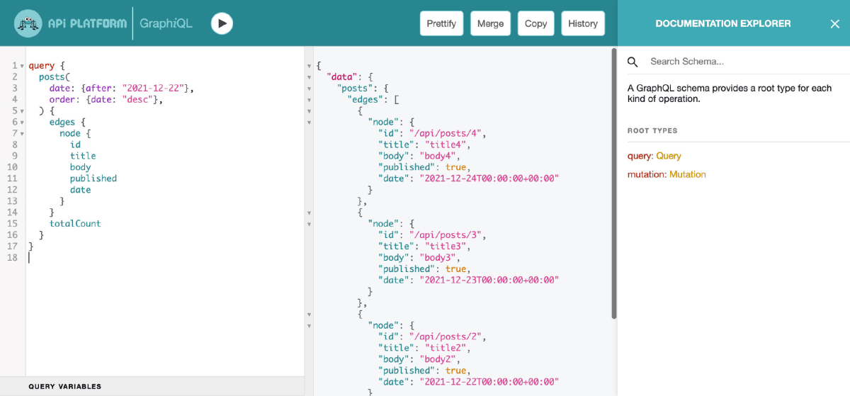 試しにGraphiQLを使って実際に Post の一覧を取得してみましょう。