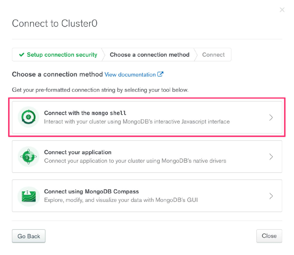 今回はCLIで接続確認をしようと思いますので、 Connect with the mongo shell を選択してください。