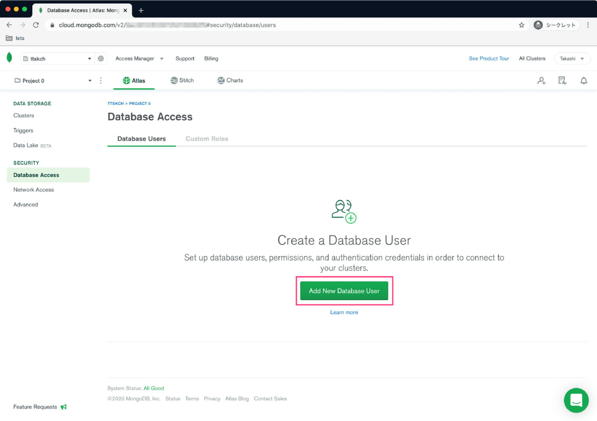 MongoDBを利用するためのDBユーザーを作成します。