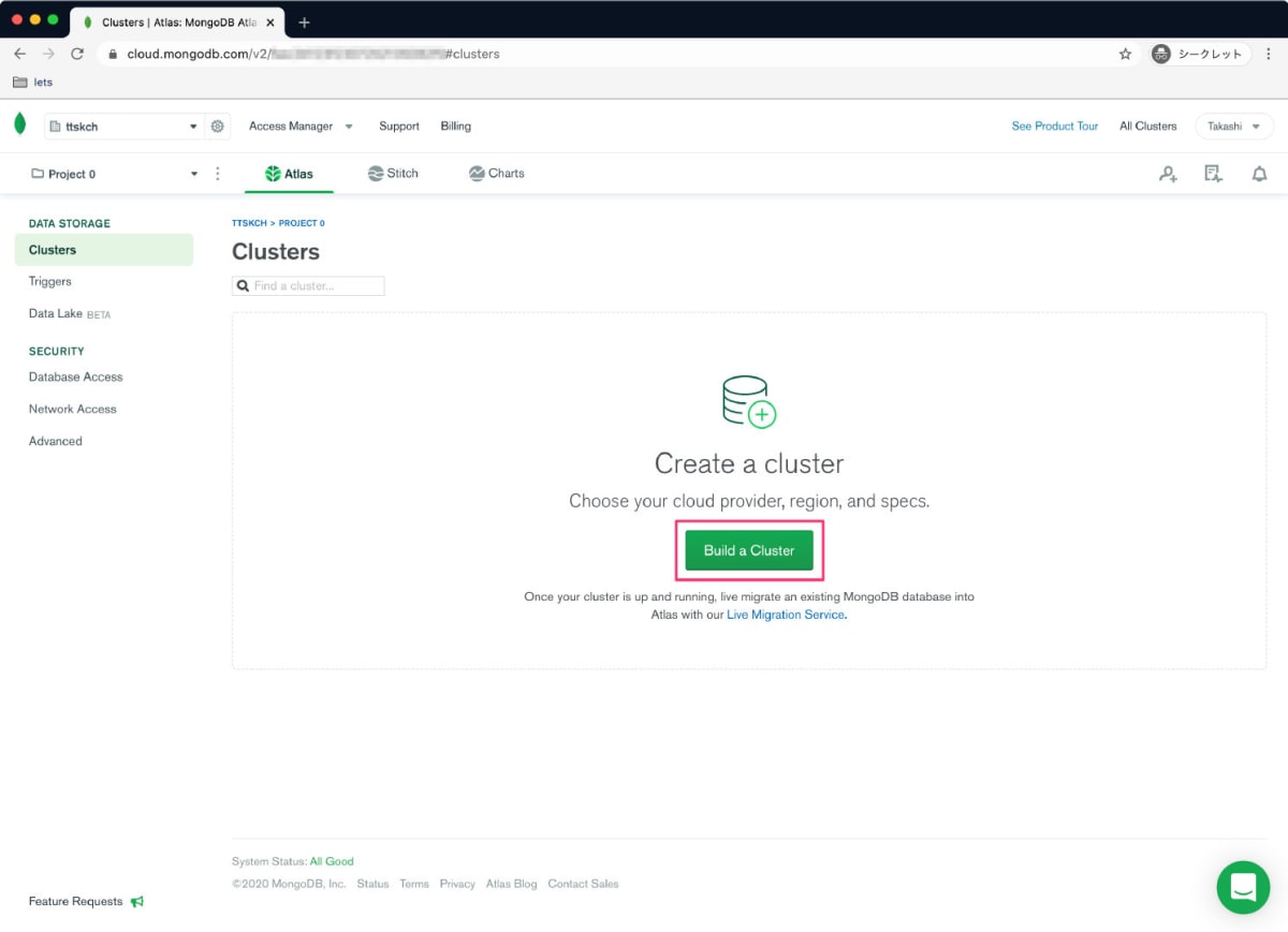ログインできたら、クラスタ一覧画面で Build a Cluster をクリックして最初のクラスタを作成します。
