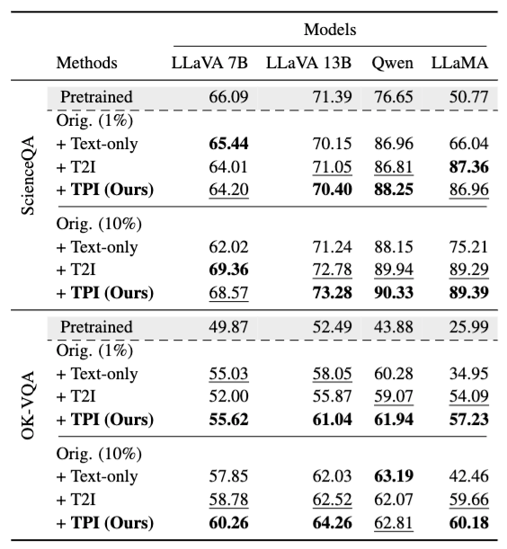 以上のように、TPI は「テキストの意味を保ったまま入力を画像側に寄せる」ことで、モダリティギャップの影響を抑えつつ、既存の VLM 学習パイプラインにそのまま載せられる点が特徴です。