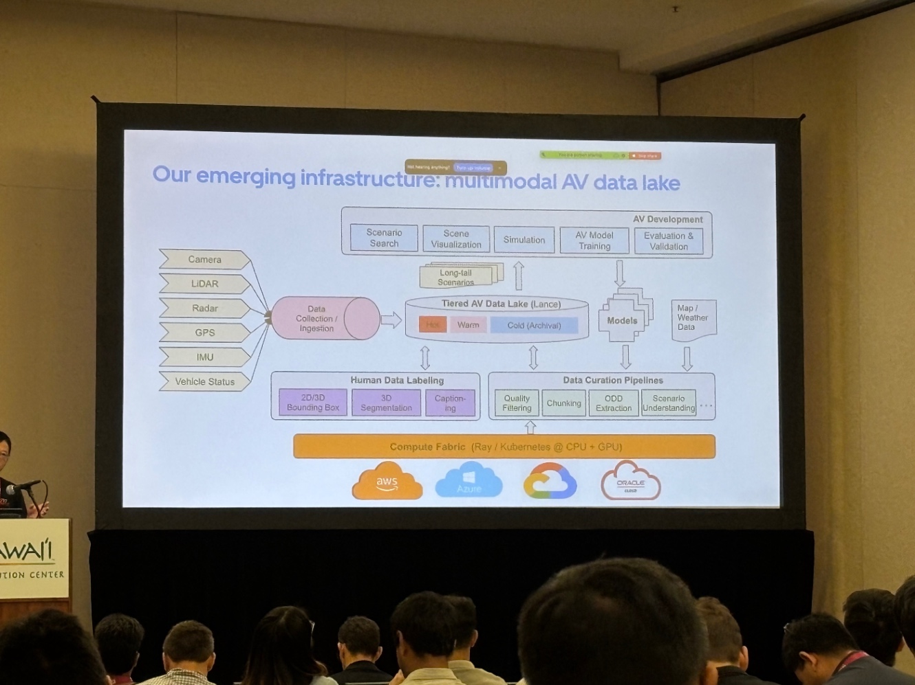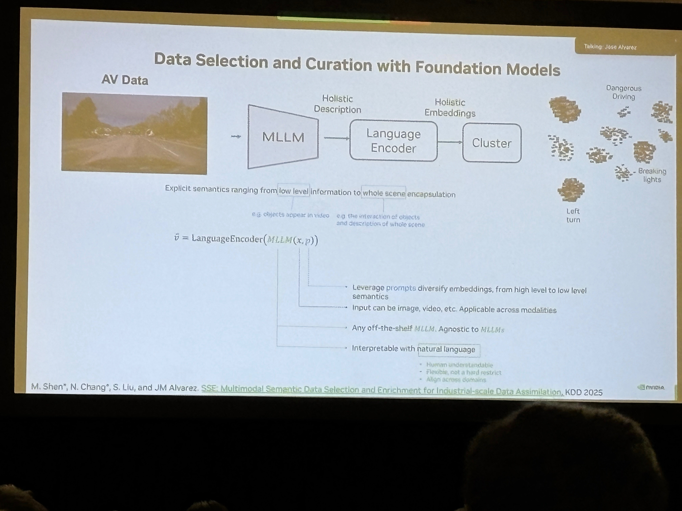 70か国・15,000都市規模のデータレイクを前提に、VLM と detection モデルを組み合わせてシナリオマイニングを実施。「走行時間ではなく、有効データ量と多様性が重要」というメッセージで、NVIDIA と同様にモデルとデータが自己改善し続ける “データフライホイール” の設計を強調していました。