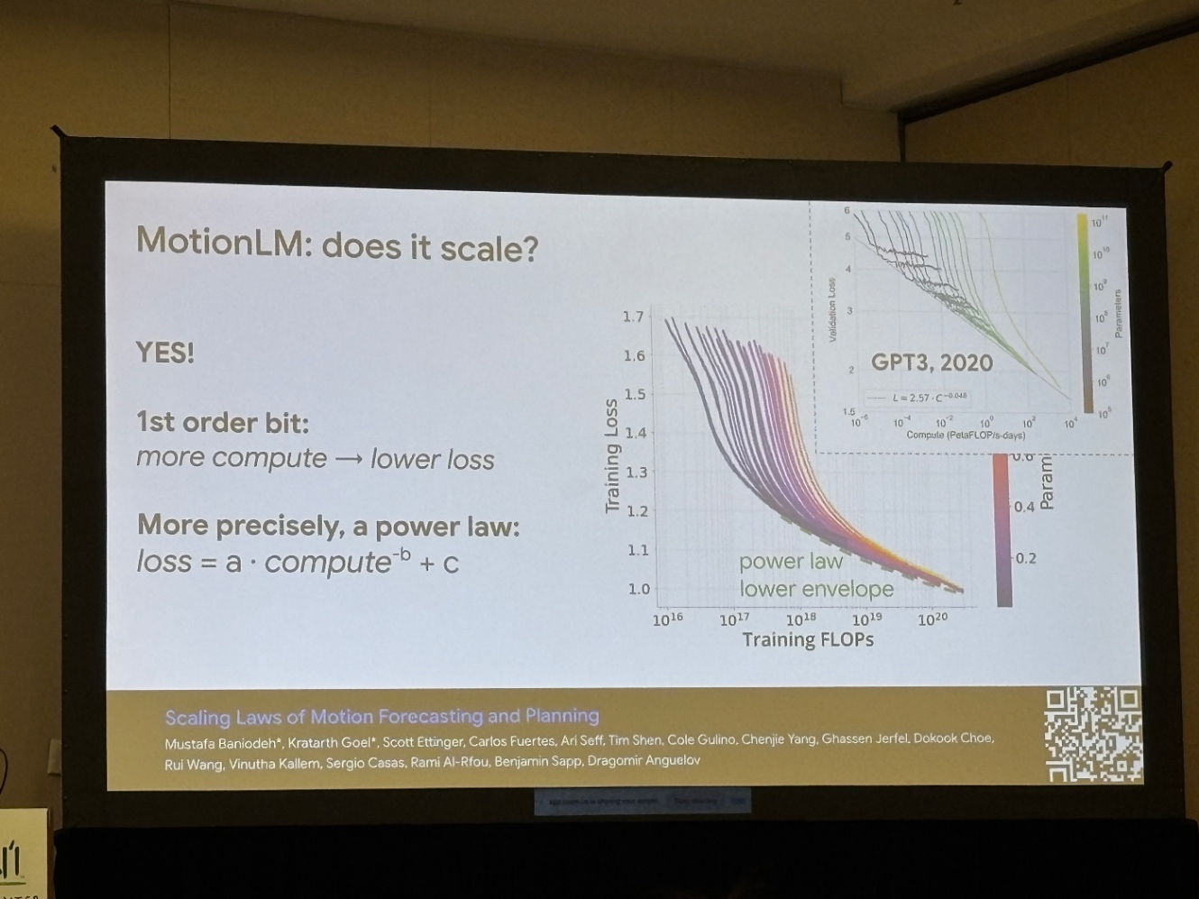 MotionLM という「将来軌跡をトークン列として扱う LM 風デコーダ」を提示し、スケーリング則と蒸留で実用ラインまで引き上げた事例を紹介しました。