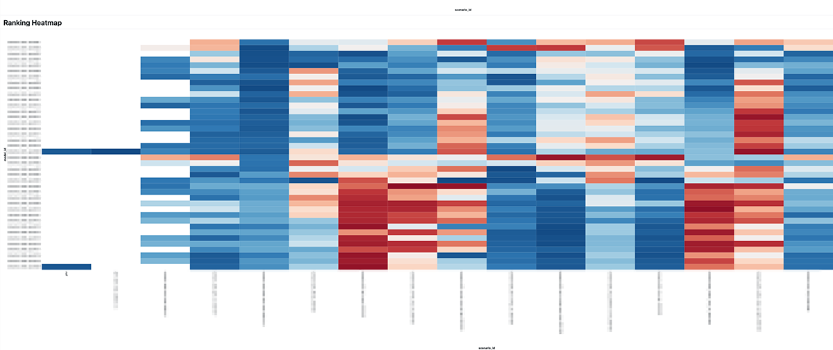 また、最近はモデル評価を行うためのシナリオテスト環境をMLOpsチームが構築しています。信号での停止など複数のシナリオがあらかじめ用意されており、学習途中のモデルのopen-loopでの性能を評価することができます。以下の画像はシナリオテストの結果を可視化するダッシュボードで、列がシナリオ、行がモデルに対応し、性能が良いほど青く表示されます。シナリオテストを使うことで、実験に行く前にモデルの挙動や性能をあらかじめ推測できるようになりました。また、モデルが改良されるごとに全体が青くなってくるので自分たちのモデルの成長具合をわかりやすく認識することができます。