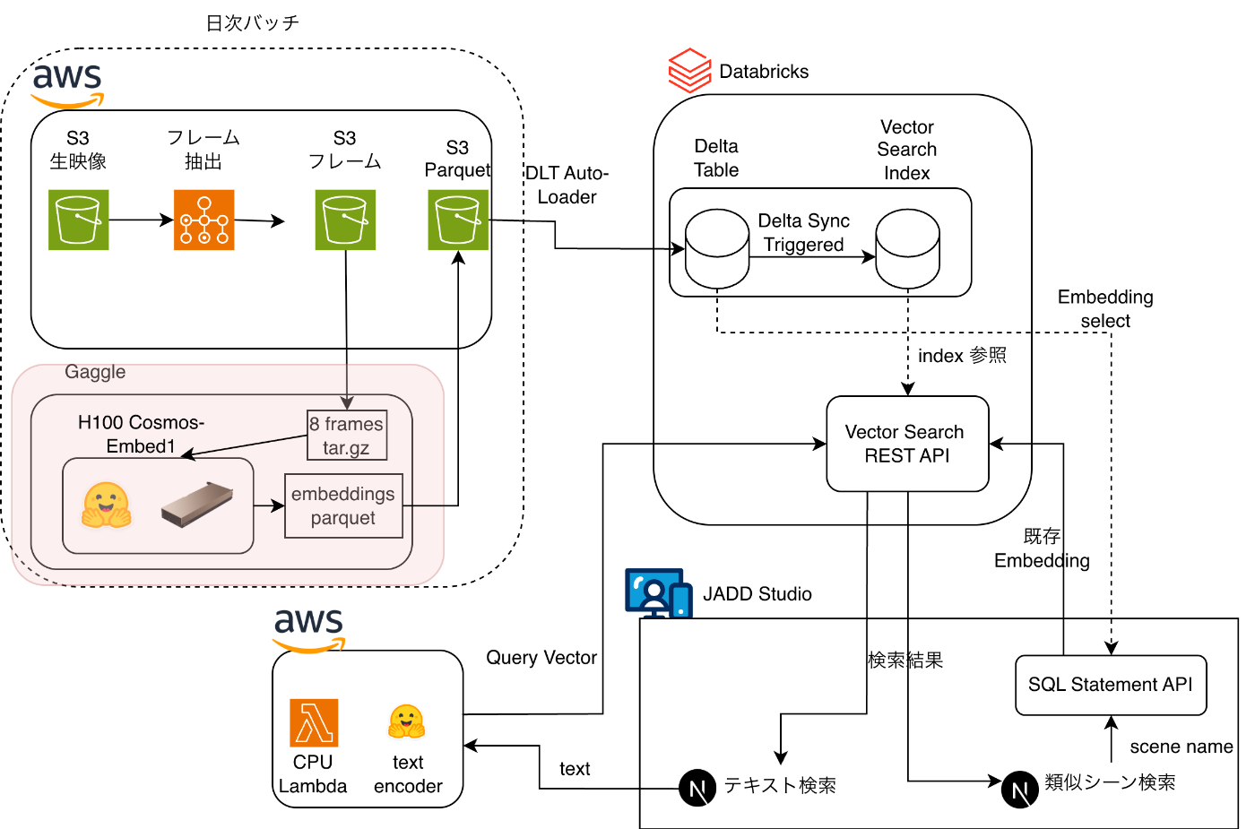- 自然言語シーン検索: テキスト入力→Lambda→ Databricks (Vector Search)