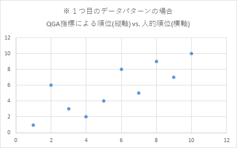 2つ目のデータパターンにおいてQGA指標が悪い結果になったのは、次の各散布図を見ればうなずけます。