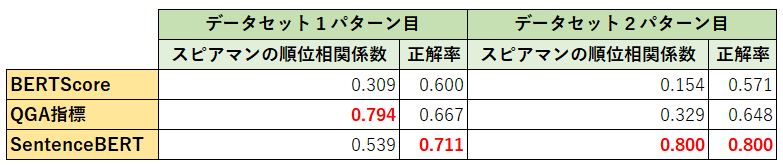 1つ目のデータパターンでは、全体的にQGA指標が良い感じです。SentenceBERTも、正解率が高くて有力です。