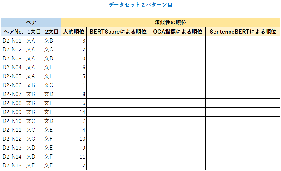 次に、データパターンごとに、文のペアの間での類似性の順位付けをします。別の言い方をすると、類似性の順位リストを作ります。