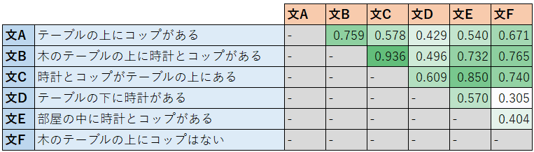 そういう文に対して類似性をうまく判定できるかに興味があるため、そういう文を追加しました。上の表でいうと、文Fのことです。