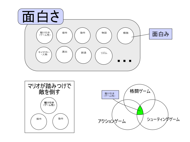 桜井さんの挙げた「駆け引き」が面白さの要素の分解不可能な最小単位の一つ(面白み)と考えたとき、同じような粒度で、面白さの要素をコレクションしておけばゲーム製作の時に便利では?と考え調査しました。