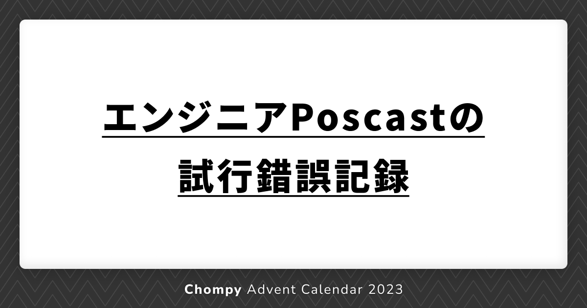 皆さまこんにちは、株式会社Chompyで技術広報を担当している佐藤です。この記事は2023 Chompy アドベントカレンダー 11日目の記事です。Chompyでは技術広報の活動として2021年11月頃からPodcast を公開しています。これまで約20本近く収録してきました。今回はこれまで試したもので特に良かったことを書いていこうと思います。気軽に読んでいただけたら嬉しいです。