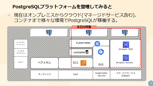 今回の説明の対象は、PostgreSQLのマネージドサービスと、Kubernetes上で稼働するPostgreSQL(ピュアKubernetesまたはEKSなどのマネージドKubernetes)ということになります。