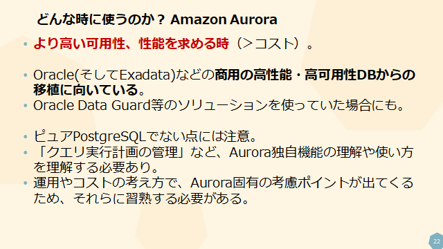 その他の特徴も踏まえ、今回セッションではAuroraを使うべきケースとして以下の結論を導いています。