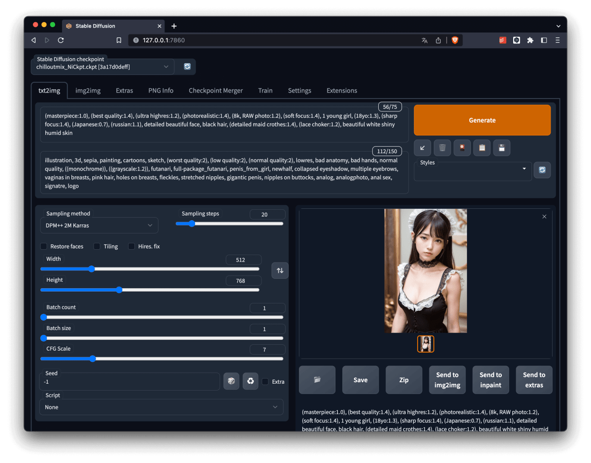 その URL にアクセスすると、見慣れた StableDiffusion WebUI が表示されます。ここから、画像生成することができます。操作については過去記事 でも解説しているので割愛します。存分に画像生成を行った後、終了するときは、そのままターミナルを消してしまうか、Ctrl+C を押して実行を強制停止します。