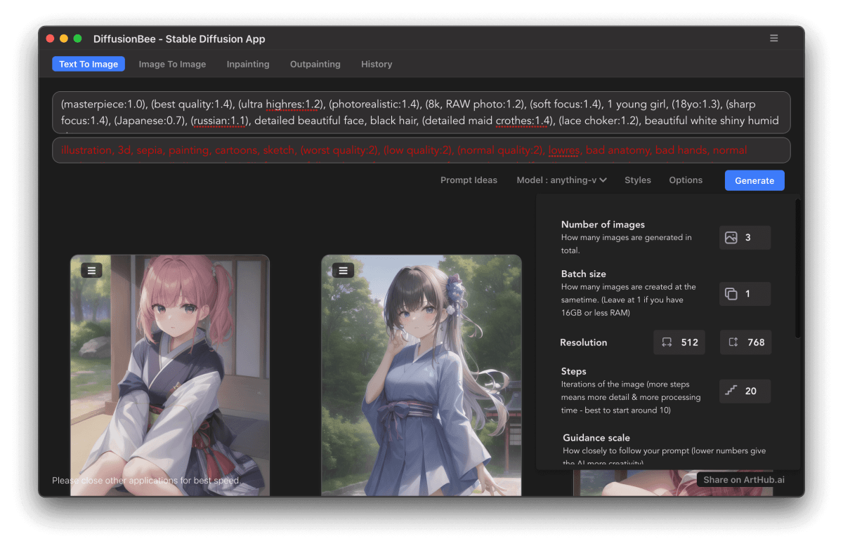 Draw Things と同様で、こちらは Mac OS 向けのみの StableDiffusion 実行アプリとして提供されており、上記のサイトからダウンロードして使用することができます。こちらもモデルを自分で用意して読み込ませることができます。使用方法についてはこちらの方が画面がシンプルでわかりやすいと思いますが、設定についてはやや簡素で、Draw Things の方が設定できる箇所は多いです。以下は、アプリケーションを起動してデフォルトのモデルをダウンロードした後に、更に追加で HuggingFace: AnythingV4 というモデルをダウンロードして読み込ませた内容です。