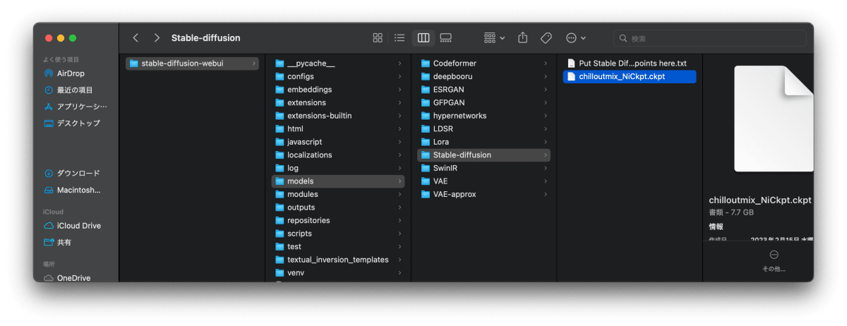 適当にモデルデータをダウンロードしてきて、stable-diffusion-webui > models > Stable-diffusion に配置します。以下の例では、Civital: ChilloutMix (要ログイン) というモデルをダウンロードしてきて、配置しています。