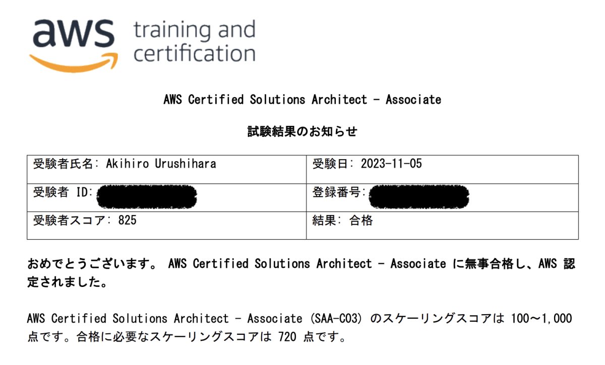 先日 AWS の認定試験である Solutions Architect - Associate (SAA-C03) の試験を受けて合格することができた ので、その記録をここに残します。 zenn では既にいっぱい SAA-C03 に合格したよ、という体験記が上がっているので、特に珍しい訳でもすごい訳でもないのですが、日記を兼ねて記載しておこうと思います。