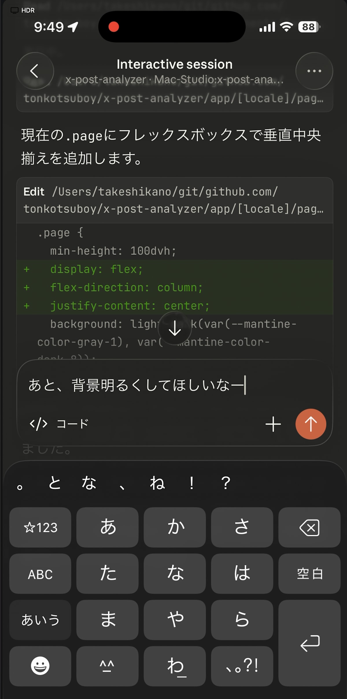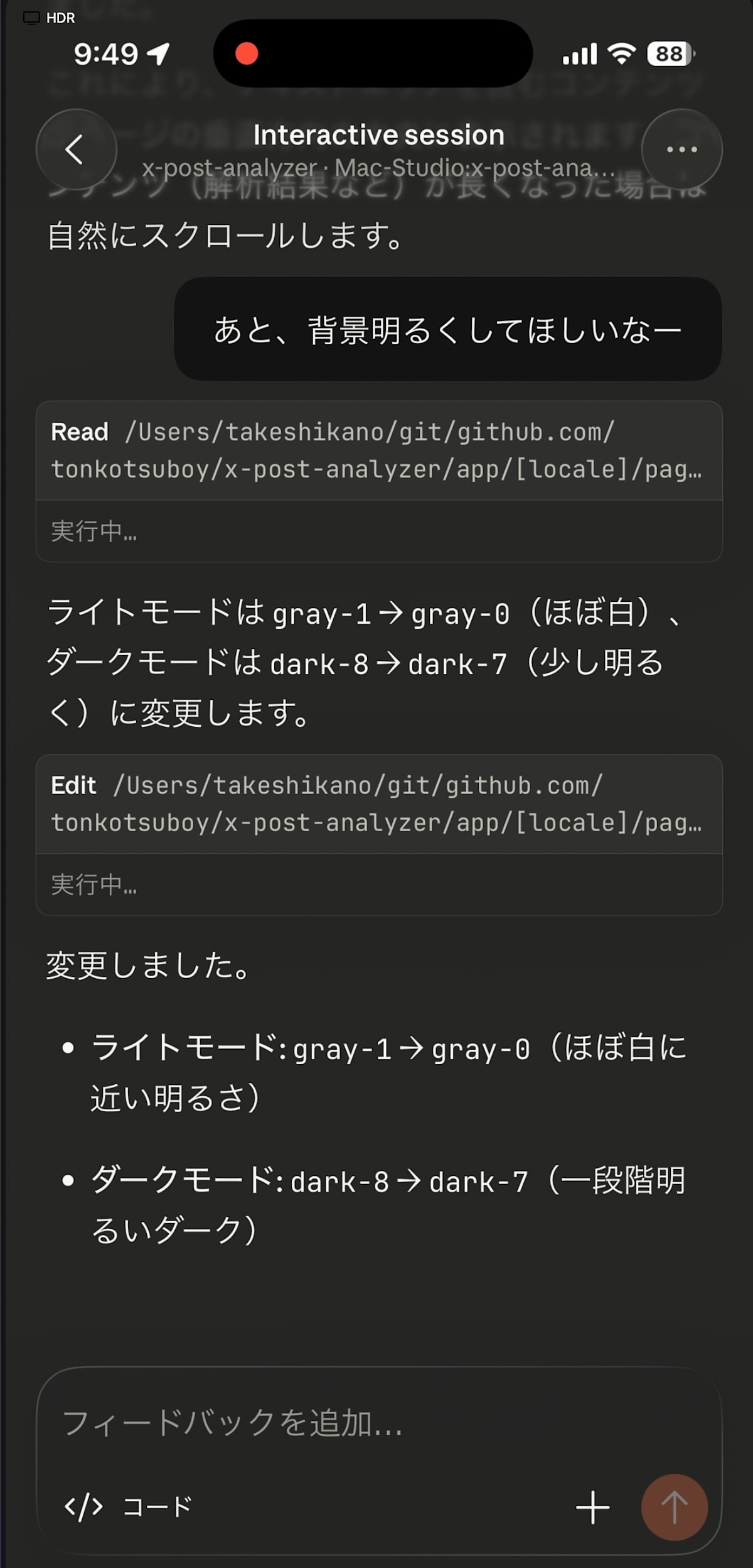 iPhoneのClaudeアプリを確認すると、"ローカルの"パソコンのセッションの様子が確認できます。リモート環境ではなく、普段作業しているパソコンのセッションが見れていることがポイントです。