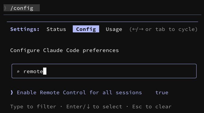 おすすめの設定はつぎのとおり。Claude Codeを起動後、/configコマンドを実行すると、「Enable Remote Control for all sessions」という項目があります。これをtrue にしておきます。こうすることで、今後の全セッションが、 スマートフォンにインストールしたClaudeアプリから確認や追加指示ができるようになります。