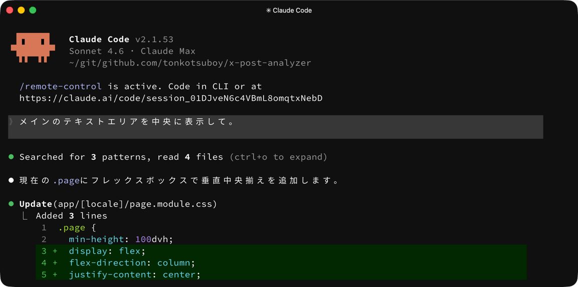 今回のRemote Controlの登場で、ついに夢が叶いました。これからはスキマ時間に贔屓の野球チームの結果を見たりジャンププラスでチェンソーマンの続きを読む前に、ローカルのClaude Codeに仕事を依頼します。
