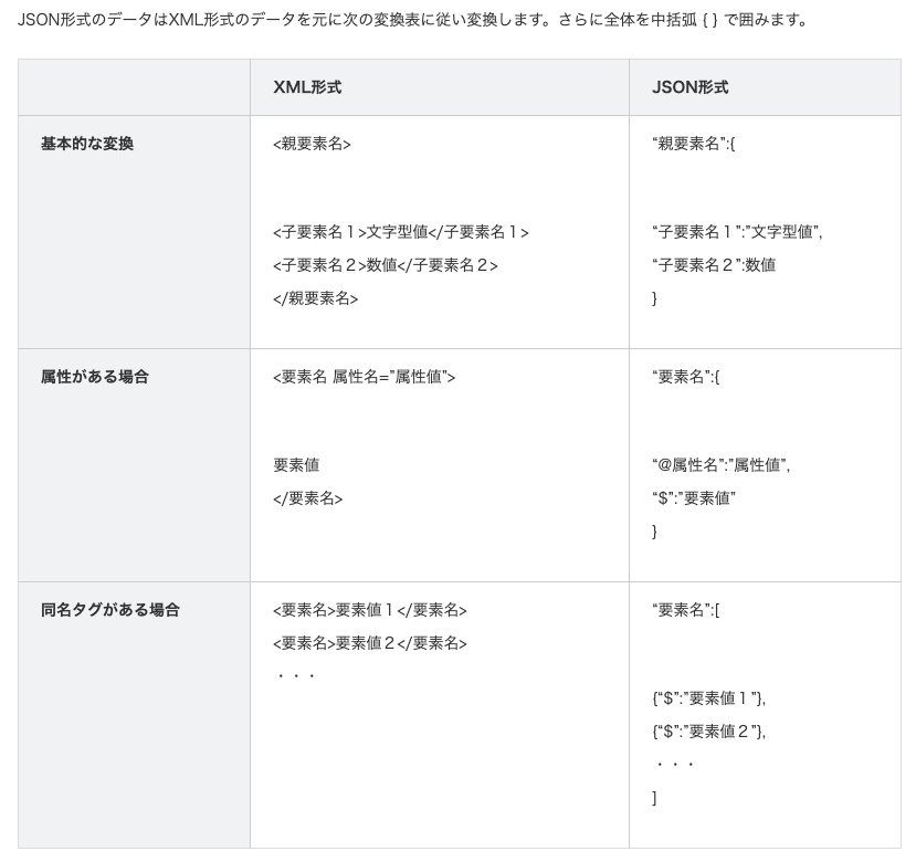 XMLが基本のレスポンスフォーマットで、JSONには下記の変換規則に従って変換されます。