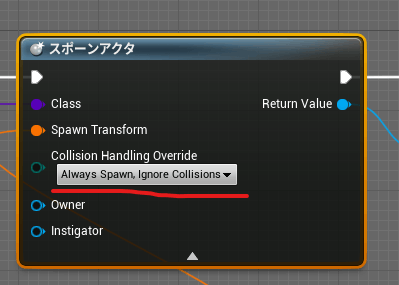 スポーンアクタノードには、"Collision Handling Override"という項目があって、ここからも設定を変更することができ、設定によってはスポーンに失敗しますのでお気をつけください。